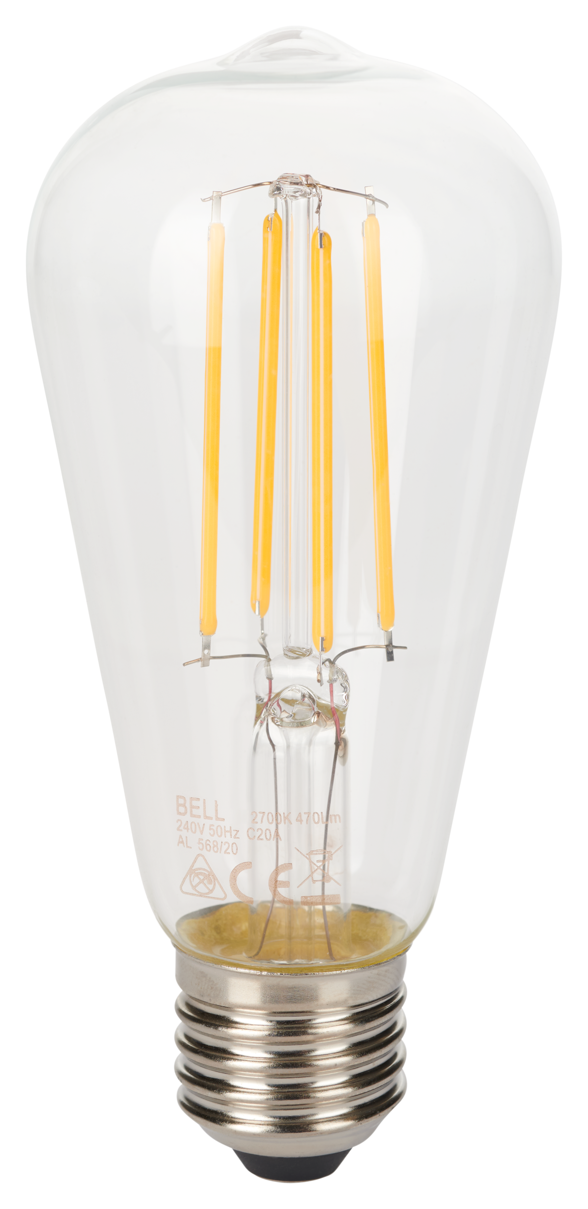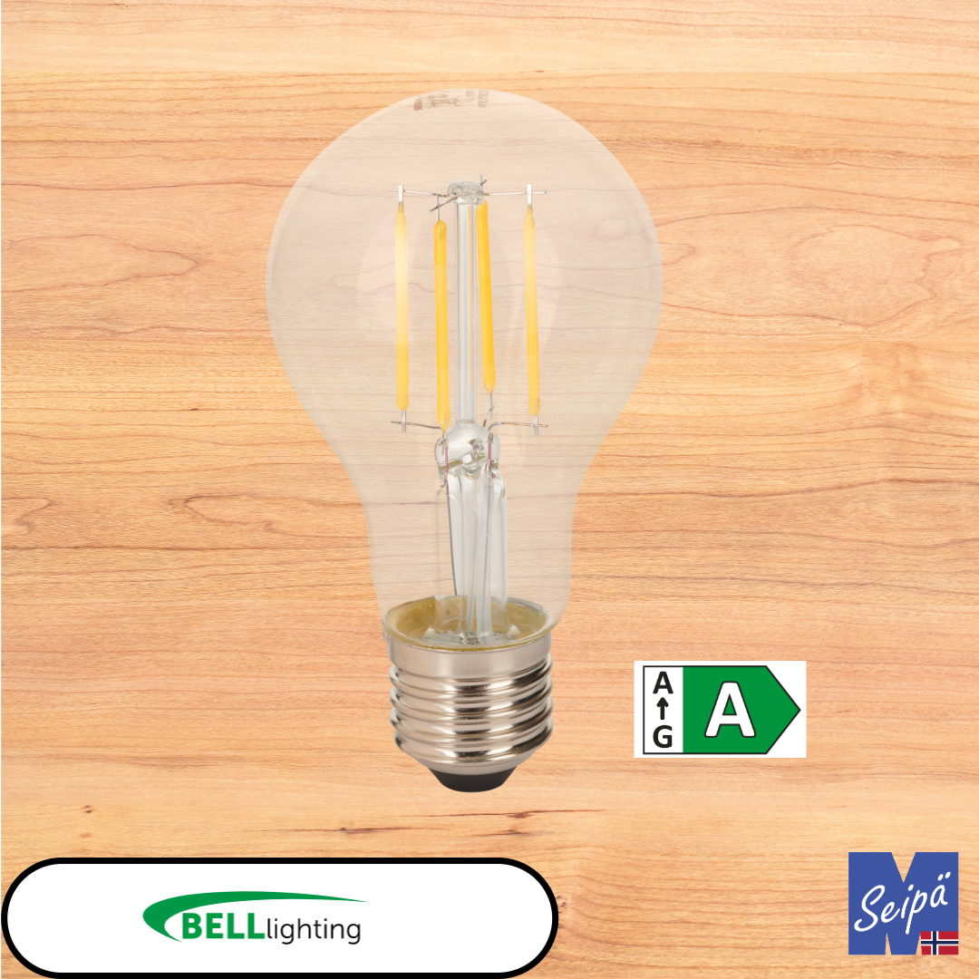 BELL LED-lyskilde med Energieffektivitetsklasse A; med kun 3,8W effekt erstatter denne en 60W glødelampe med vanlig interiørfarge gyllen varmhvit 2700K, 50.000 timers levetid og 5 års garanti. Dette er perfekt for kunde som vil ha maks energibesparelse. Dimmebar, dekorativ med klart glass og filament LED. Finnes som normal A60 og ST64. Ta kontakt for mer informasjon ms@mseipa.com